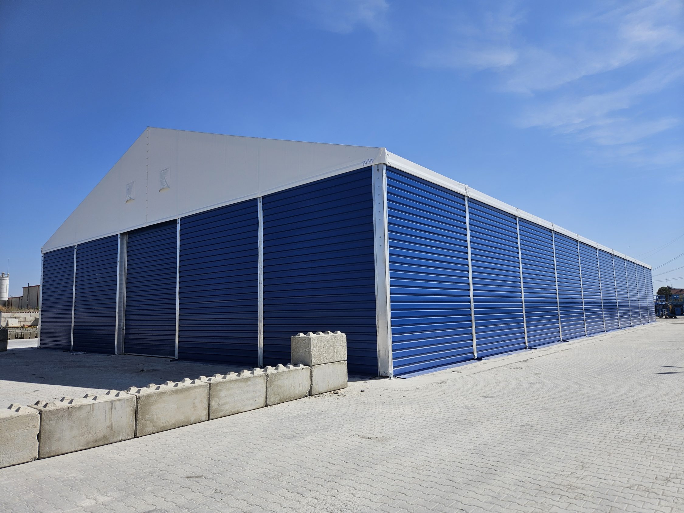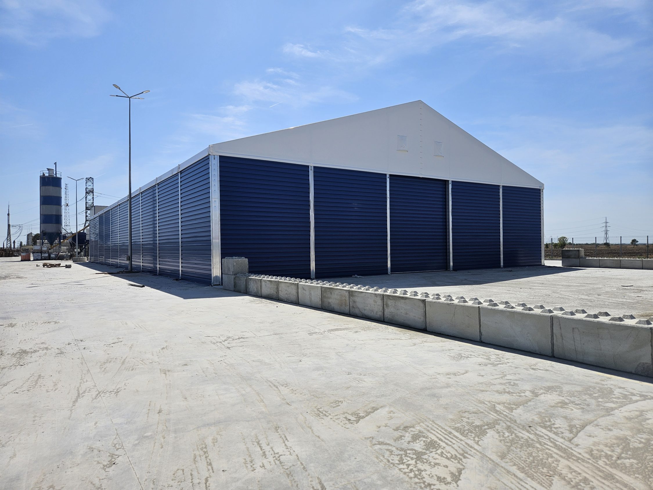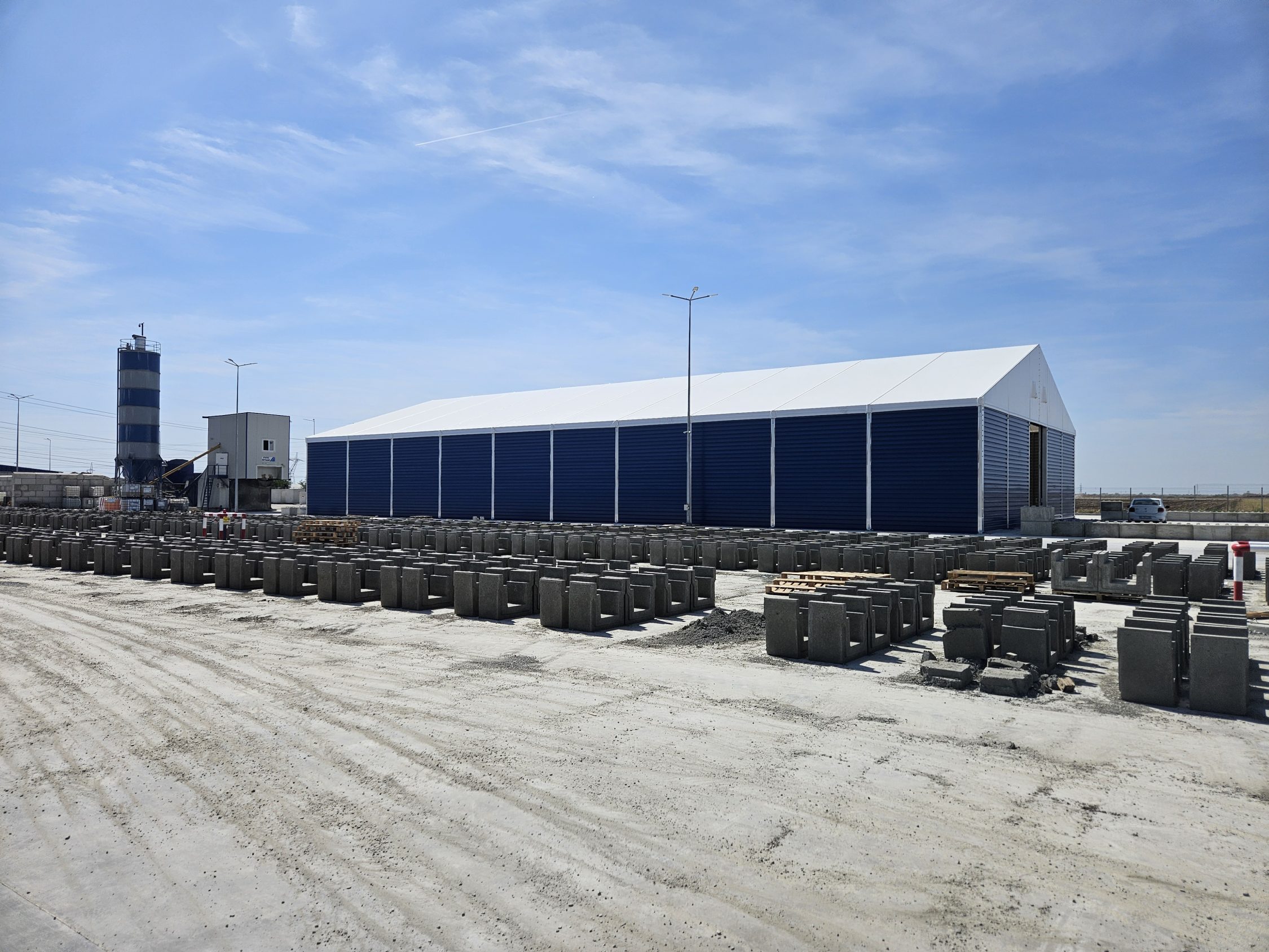 Soluția de cort industrial beton a fost aleasă pentru a permite extinderea rapidă a capacității de producție și depozitare.