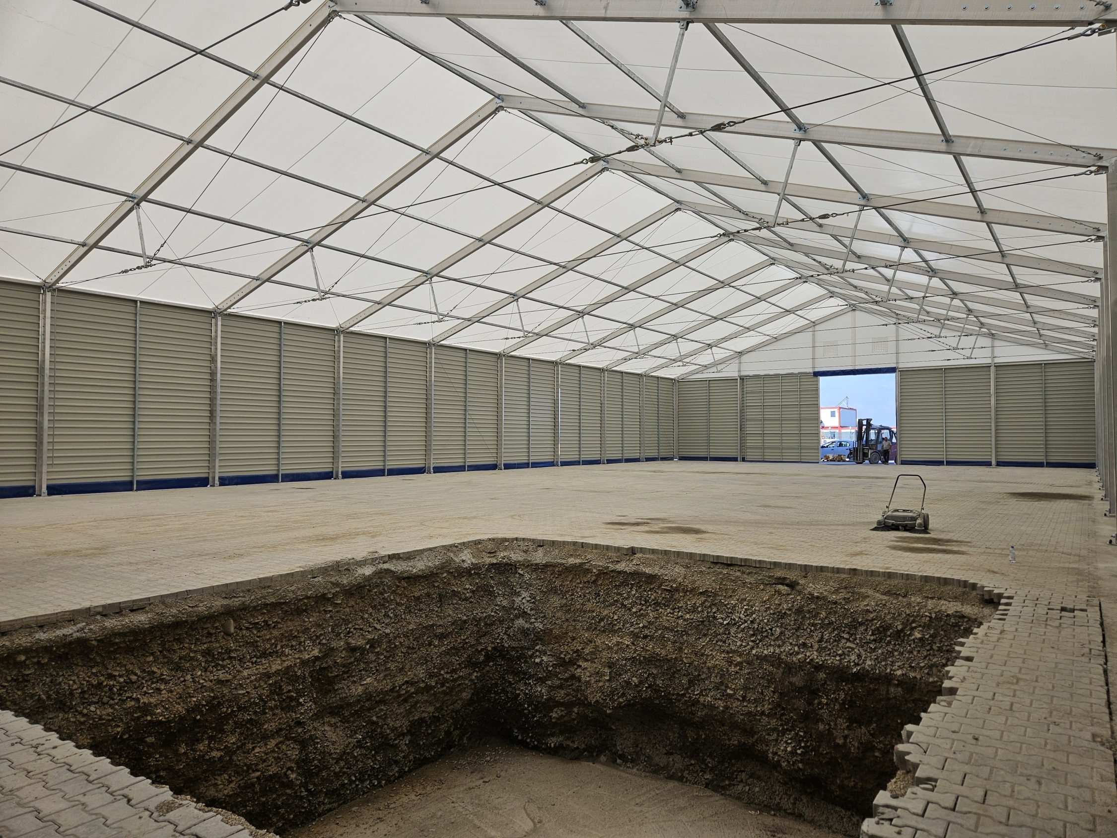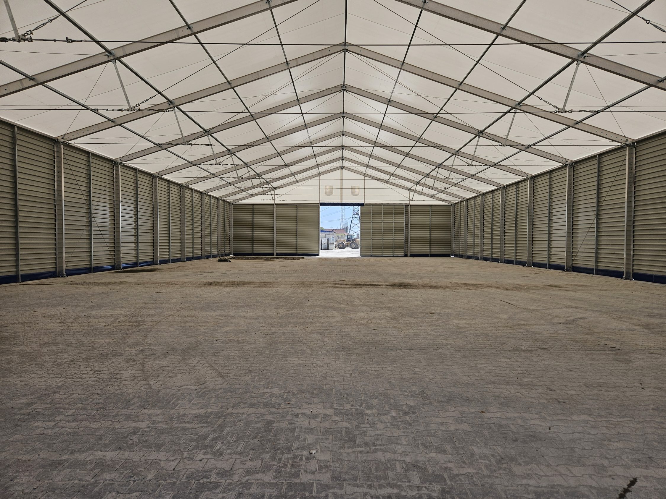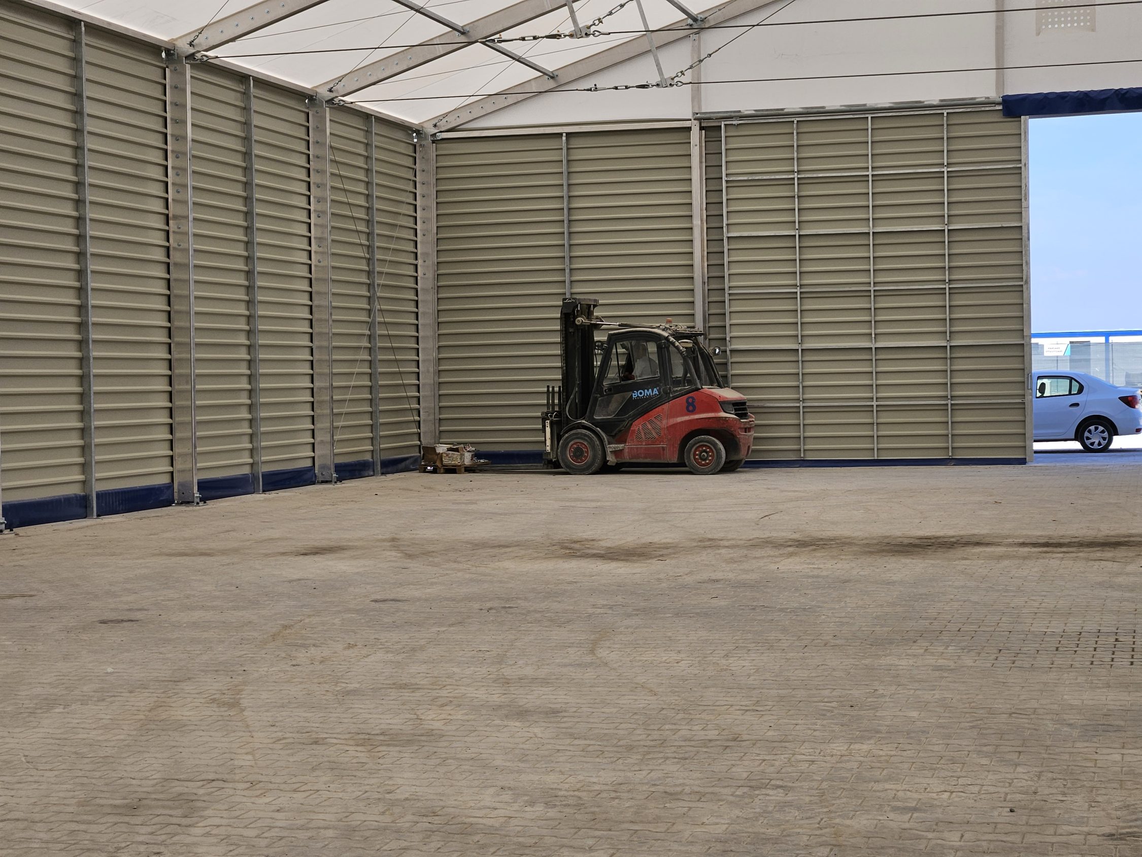 Soluția de cort industrial beton a fost aleasă pentru a permite extinderea rapidă a capacității de producție și depozitare.